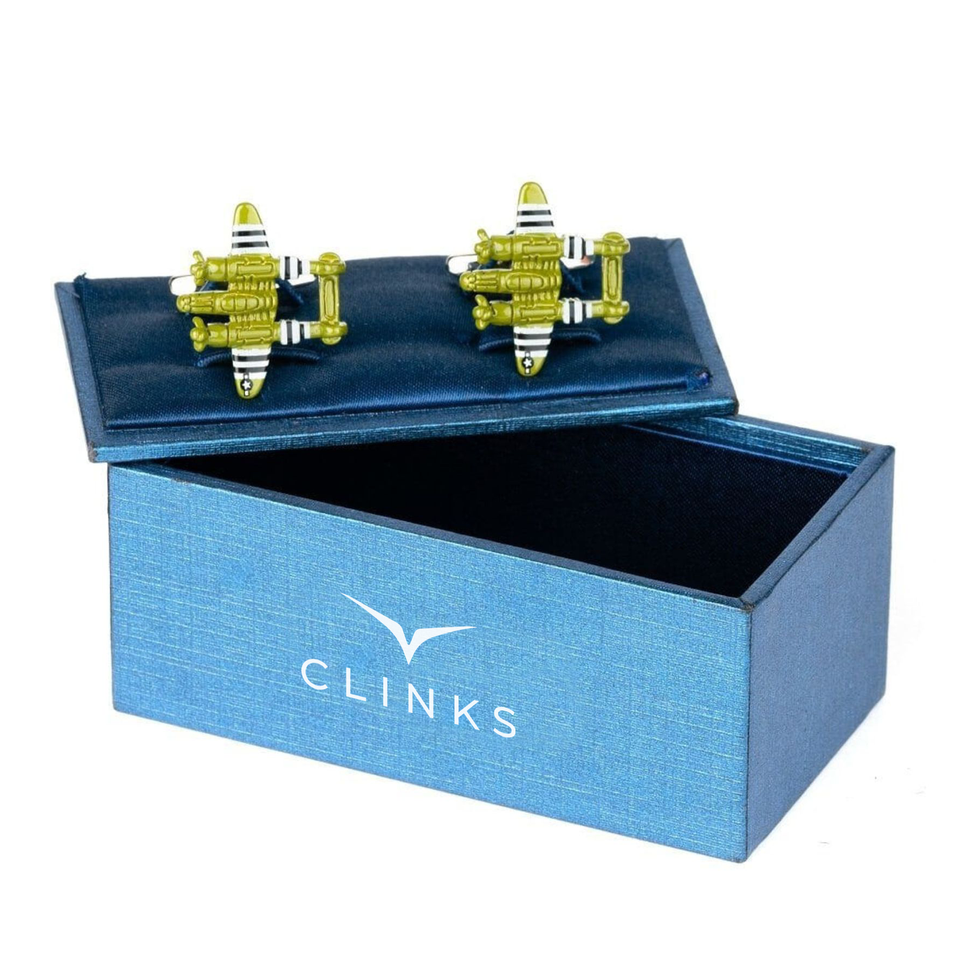Comes in a stylish gift boxThese mini-replica cufflinks inspired by the P-38 Lockheed fighter jet created in WW2 feature the US military aviation insignia from that era. It is perfect for anyone who has a keen interest in aeroplanes or WW2. These Green Fighter Jet Cufflinks can be worn on ANY dress shirt with Shirt Cuff Adapter. They come presented in a blue gift box and make for a very thoughtful present.