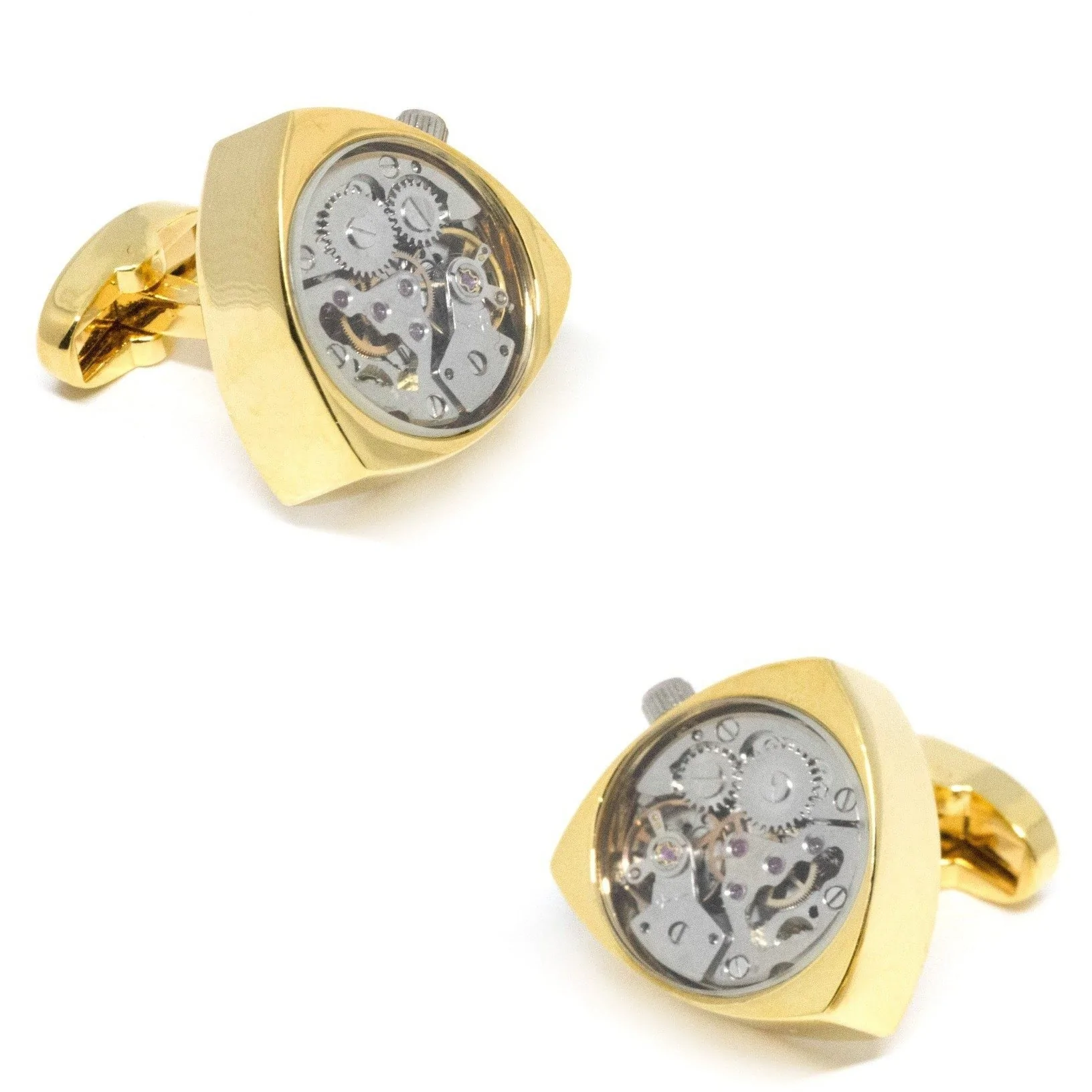 Comes in a stylish gift boxThese cufflinks are constructed from actual wind-up watch movements with glass cover on top., which have been then placed into a specially designed cufflink casing. Winding the watch movement up results in the large gold wheel spinning in a backwards/forwards movement, while the cogs behind tick away. A great piece which really makes a statement with its cogs, levers and jewels. Wear engineering at its finest. These feature a gold casing, with a silver face and some gold cogs/wheels.
