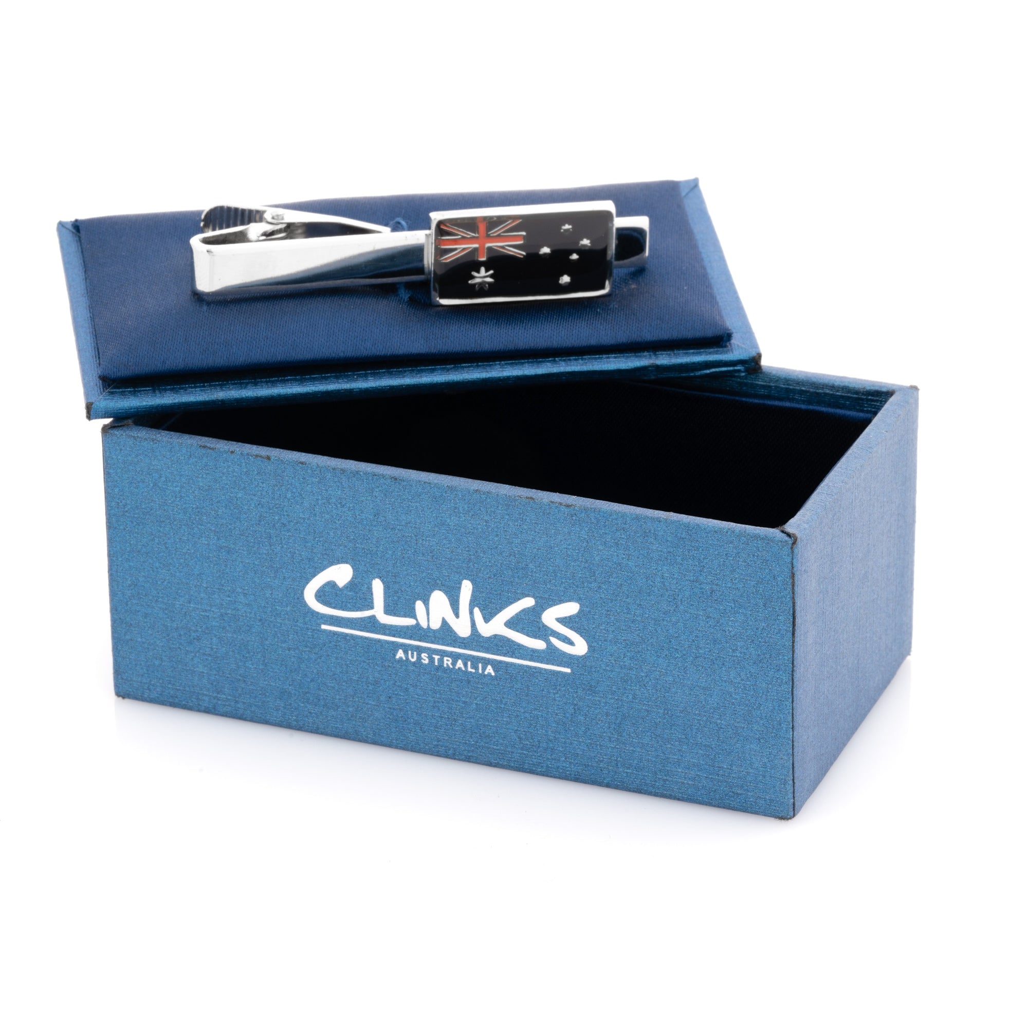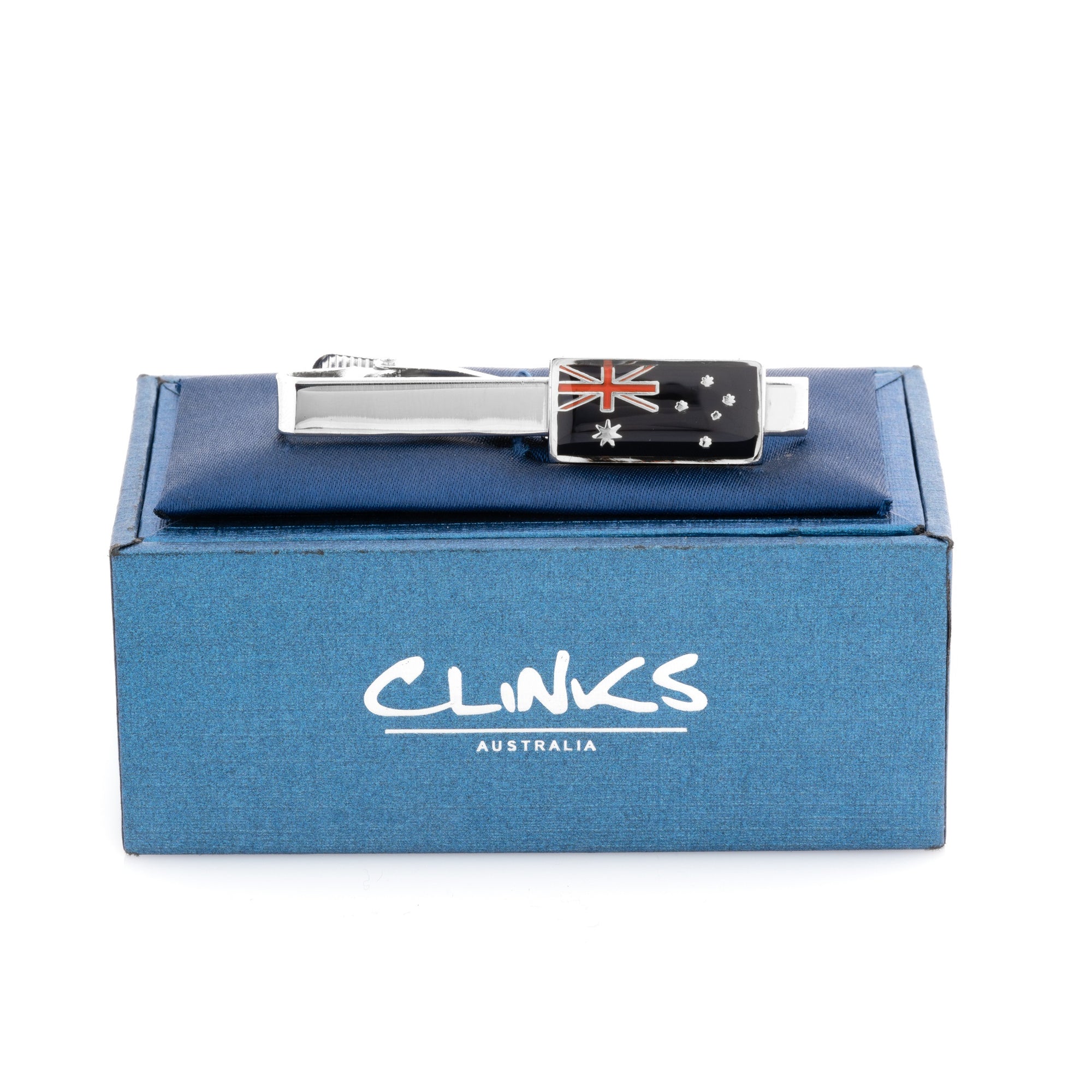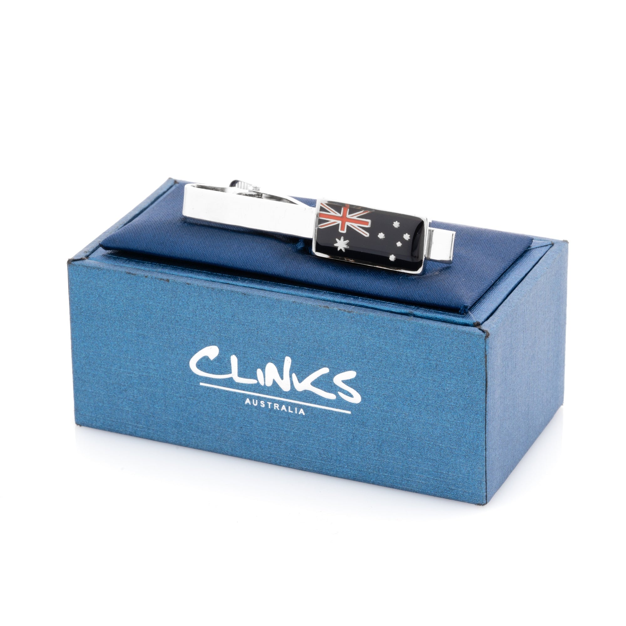 A simple silver rhodium plated tie clip featuring the Australian flag. Aussie Aussie Aussie! Oi Oi Oi! Presented in a lovely gift box.