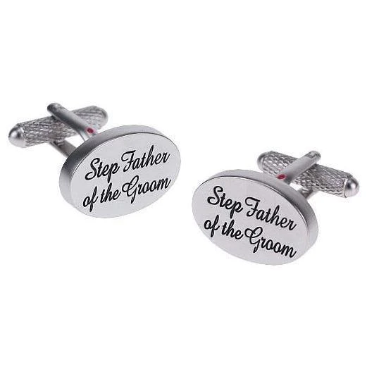 Comes in a stylish gift boxAn oval cufflink with black script writing perfect for the Step Father of the Groom.