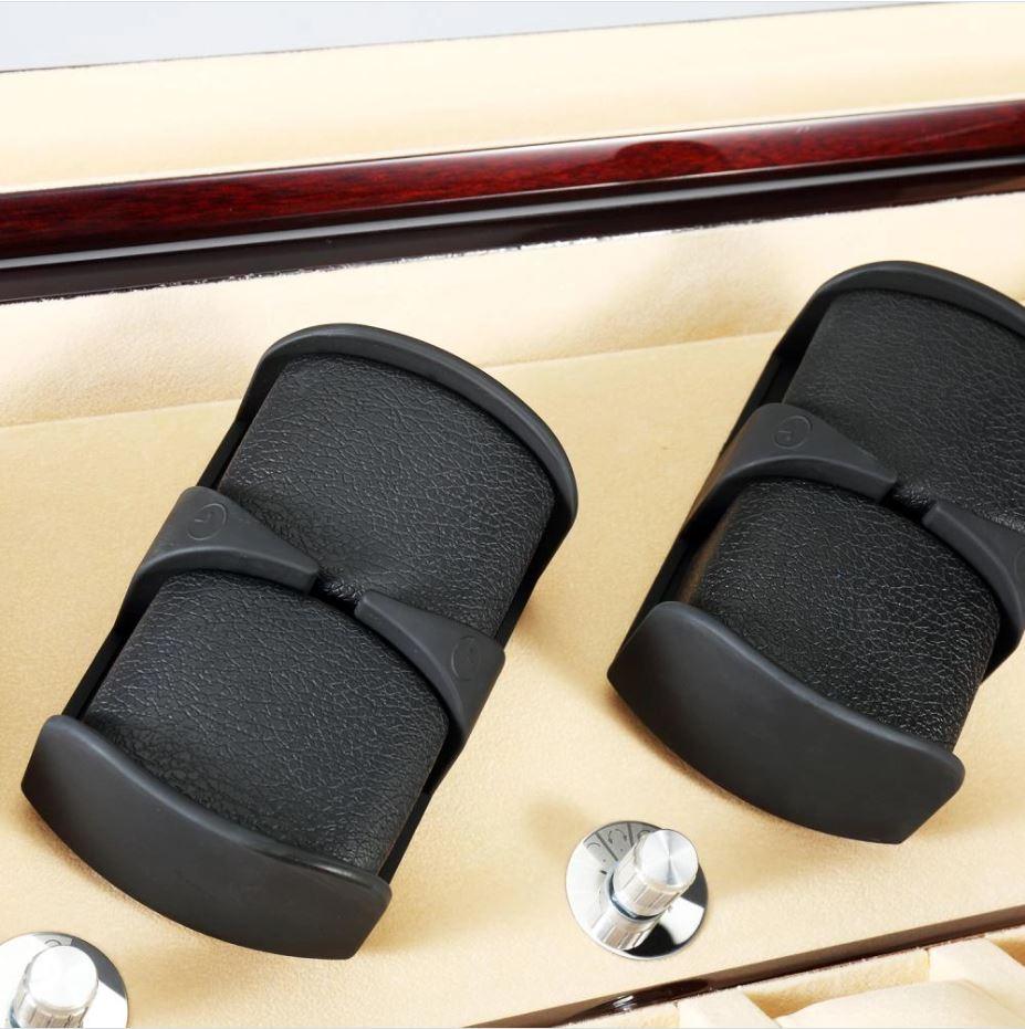 This automatic watch winder box keeps your automatic watches wound and ready to wear. This box has the capacity for 8 watches on the 4 winding rotors and storage space for an additional 8 watches.