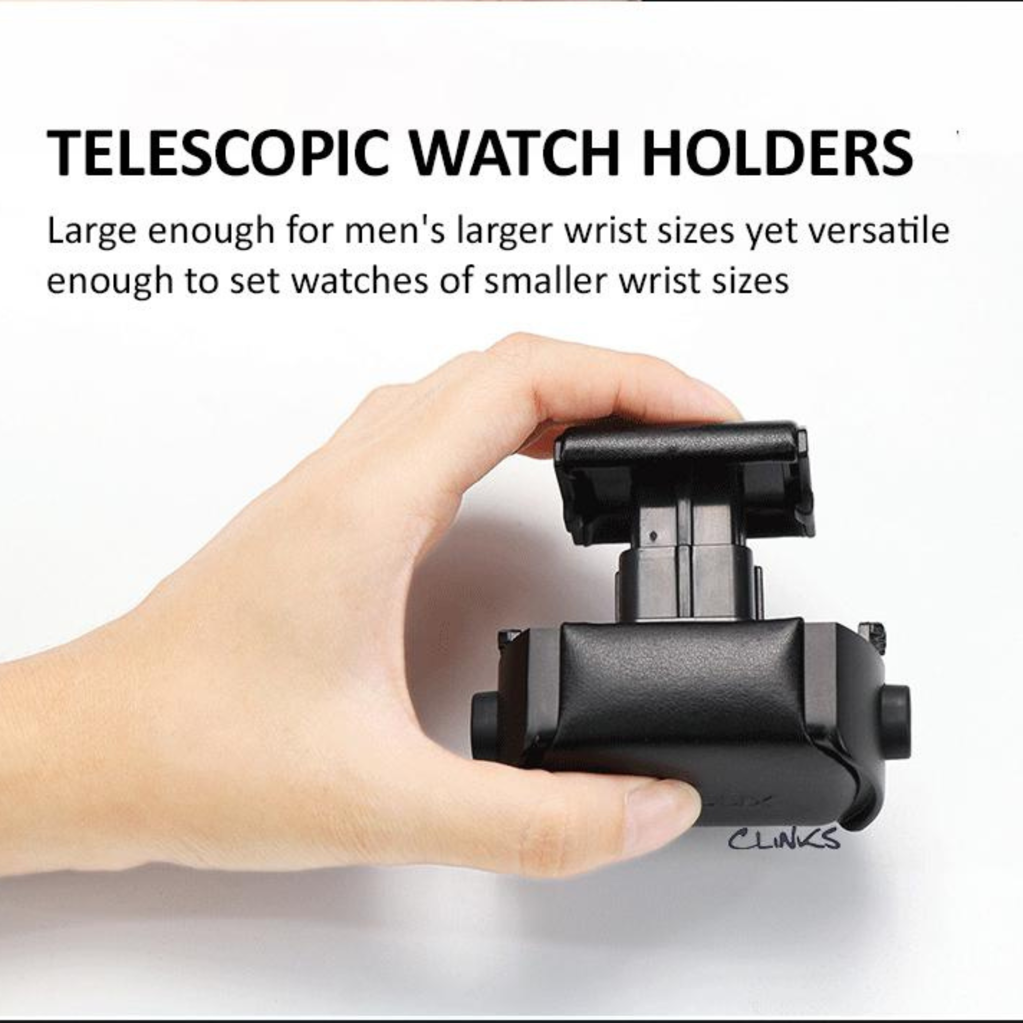 FITS ALL WATCHES: Telescopic watch holders fit any bracelet and strap size. Our Patented new watch holder is large enough for Men's Larger Wrist Sizes yet versatile enough to set watches of smaller wrist sizes. Holds Watches up to 70mm Wide. Watch Holder for all wrist sizes from 16 to 22cm.