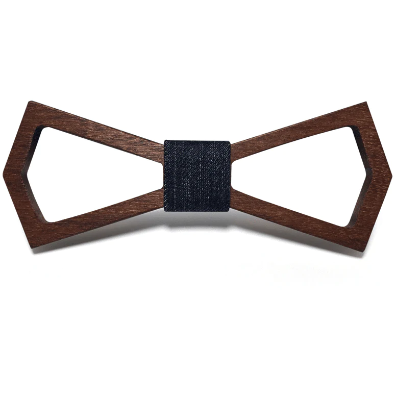 A cute and quirky outline bow tie in a beautiful natural wood featuring a blue denim fabric. Handcrafted in solid wood with an adjustable neck strap. A statement piece for someone who loves to set a trend. Perfect style for weddings, formals and funky parties. Presented in a stylish blue gift box.