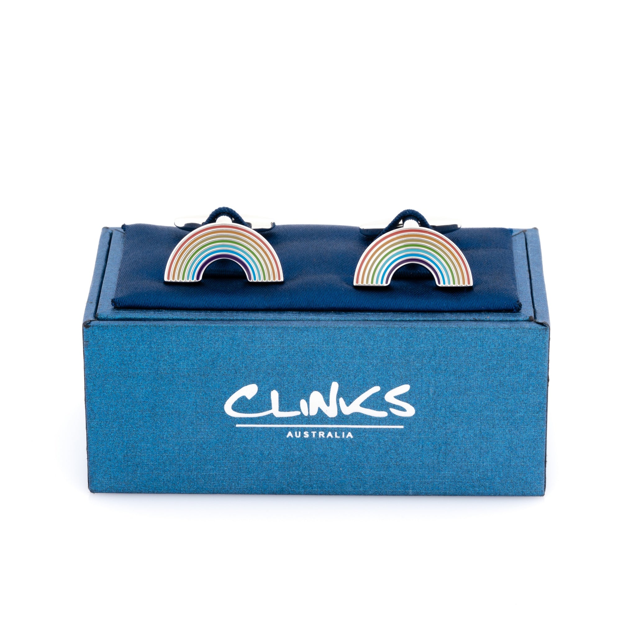 Celebrate the Rainbow with these bright rainbow cufflinks. The rainbow has been long used and are displayed in many cultures around the world as a sign of diversity and inclusiveness, of hope and of yearning. These rainbow cufflinks look great on any shirt, and are really fun. Made of coloured enamel on a Silver Rhodium plated base. Presented in a classy gift box.