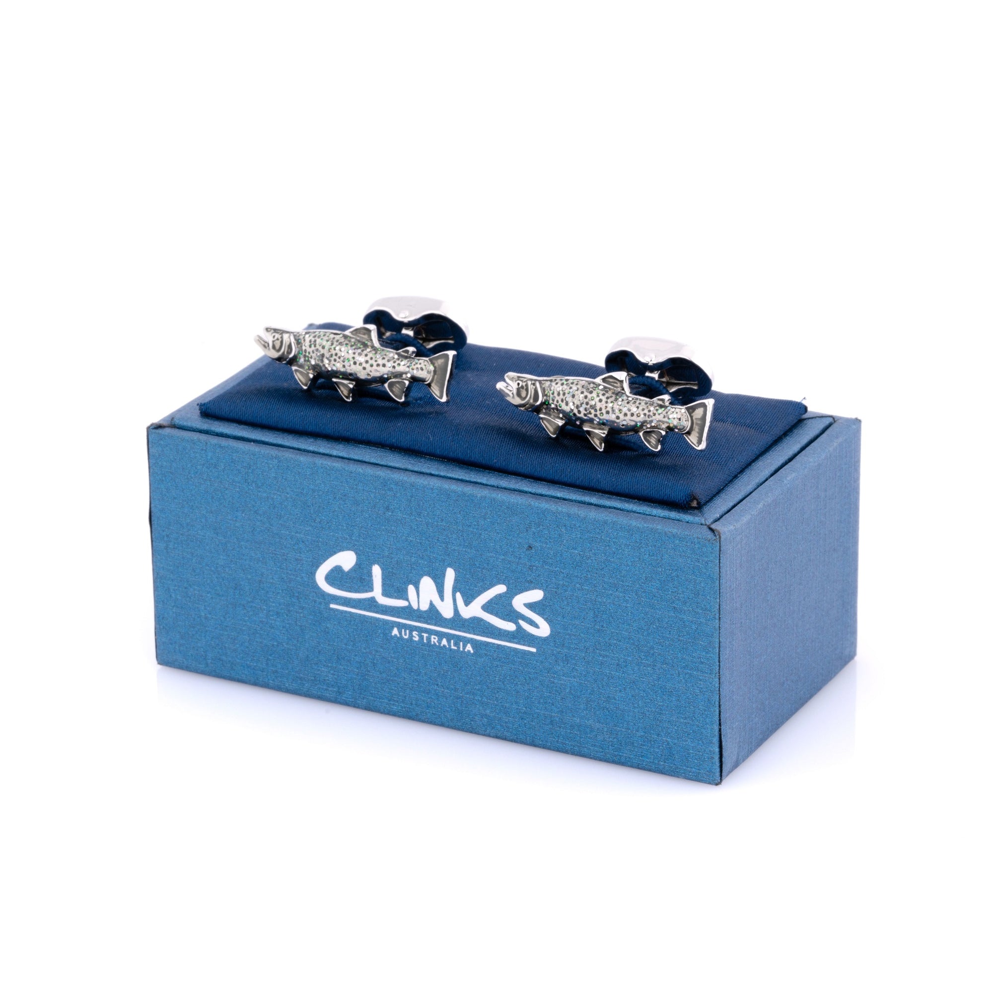 Comes in a stylish gift boxThese stunningly designed trout fish cufflinks are a sight to behold. They feature rainbow coloured scales which sparkle in the light. The photo simply does not do this set justice. A must-see to appreciate pair which will be loved by the avid fisher. Presented in a beautiful gift box.