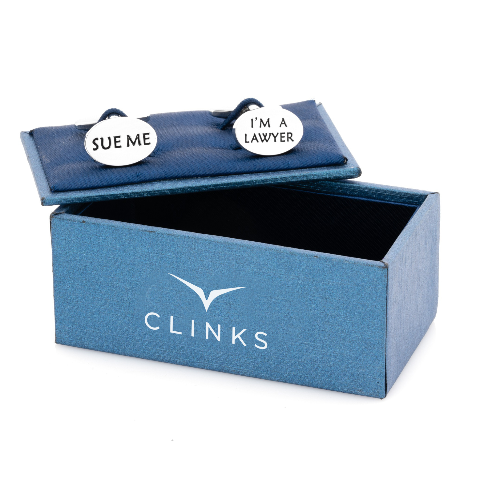 Comes in a stylish gift boxAnd who said lawyers don't have a sense of humor? This novelty cufflink selection is an ideal gift for that lawyer, judge, an attorney friend of yours, or anyone affiliated with the legal profession. Silver oval cufflinks with black engraving, "Sue Me' on one and "I'm a lawyer" on the other.