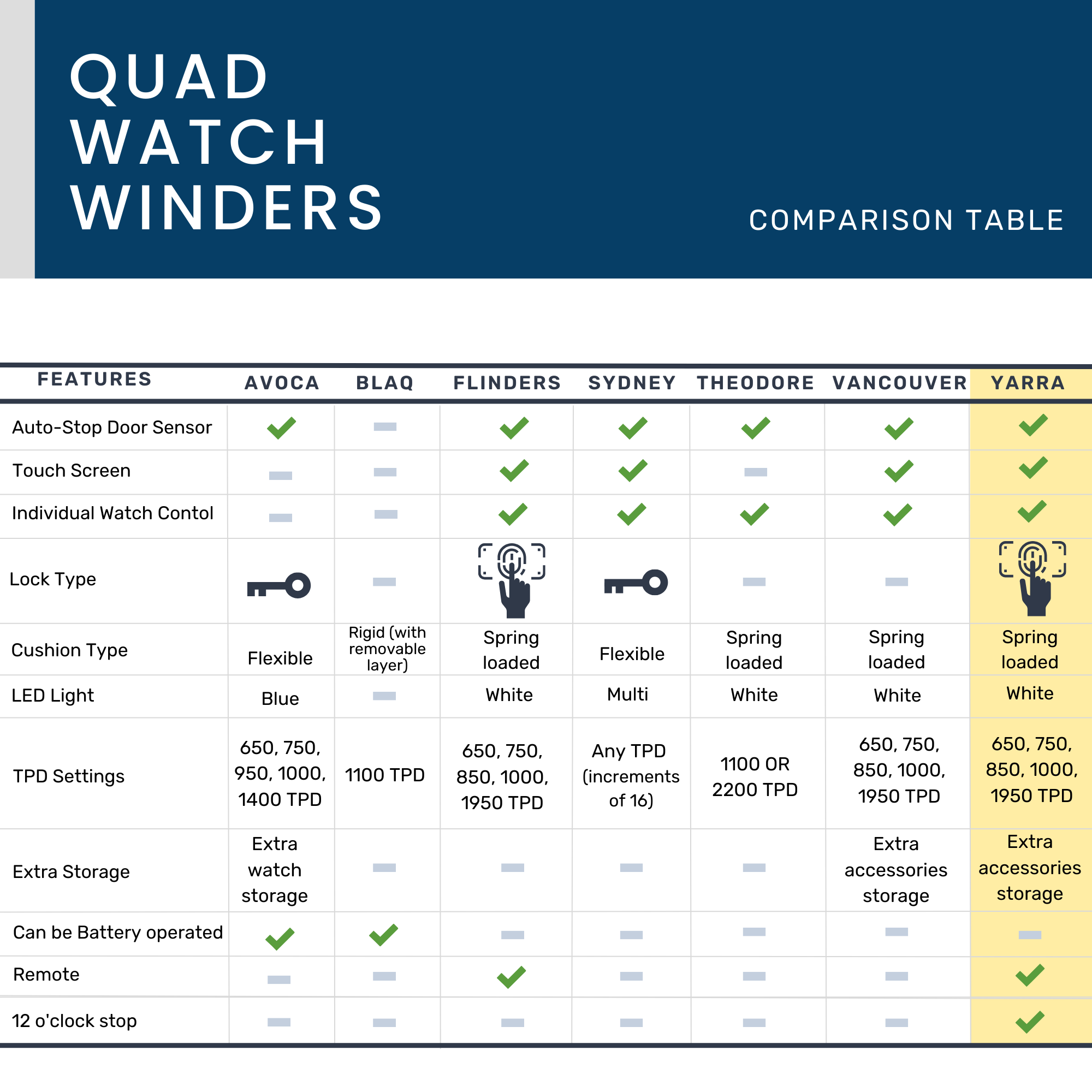 SAFE:  Like our other collection of watch winders, Yarra Quad Watch Winders are equipped with a safety program that ensures that they can never over-wind a timepiece.